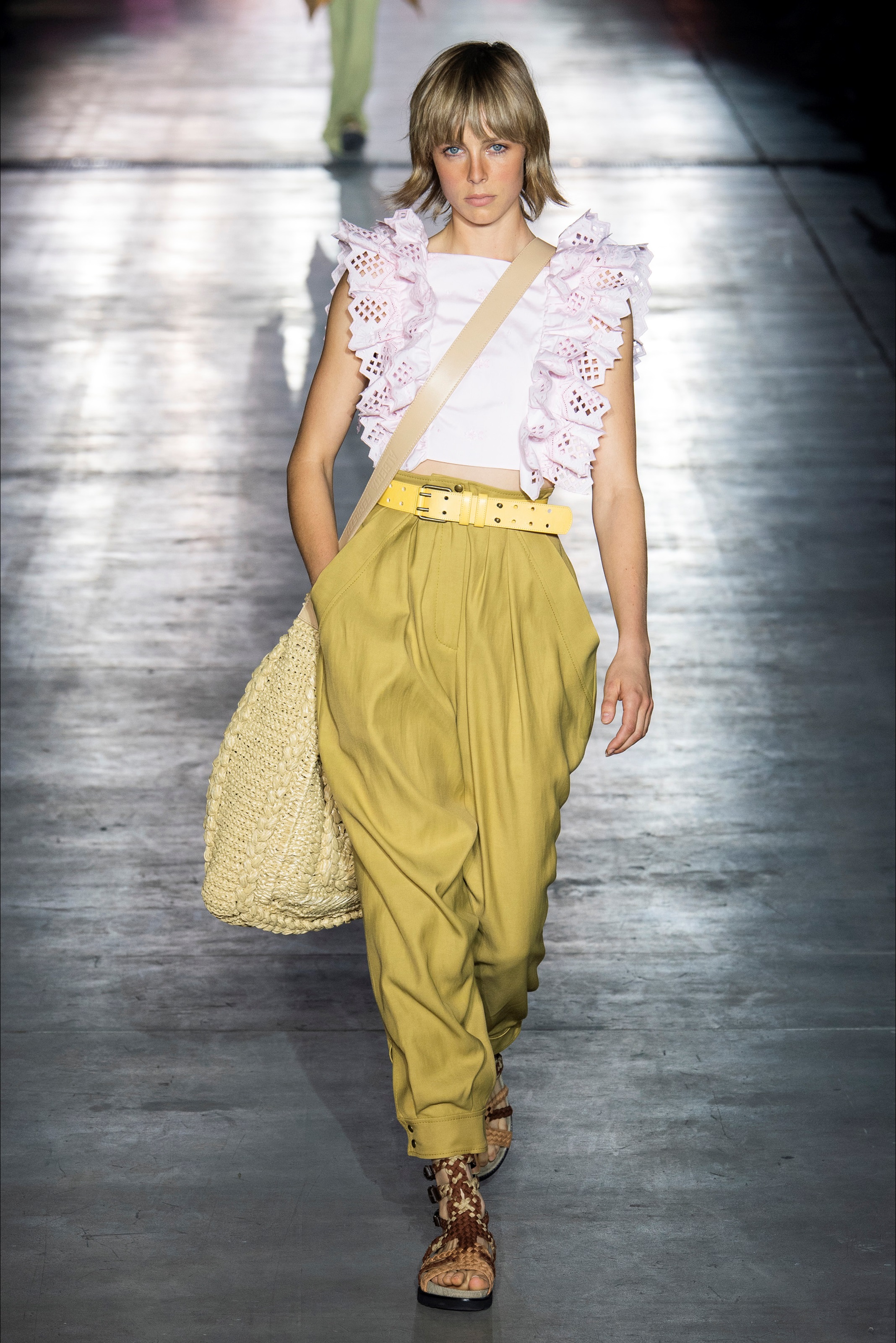 Crop top in sangallo con fiocco- Pantalone oversize color kaki- Cintura gialla- Sandali bassi con fasce intrecciate- Sacca color corda fatta a mano in rafia