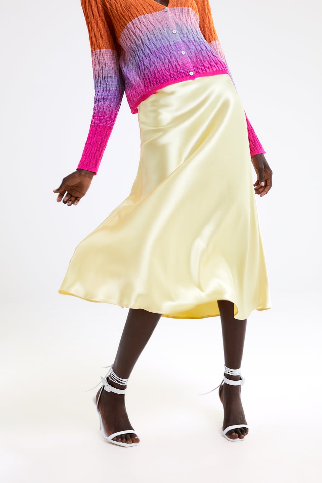 - Camicia bianca con rouches – Gonna gialla in tweed – Borsa a tracolla gialla – Sandali bianchi e neri
