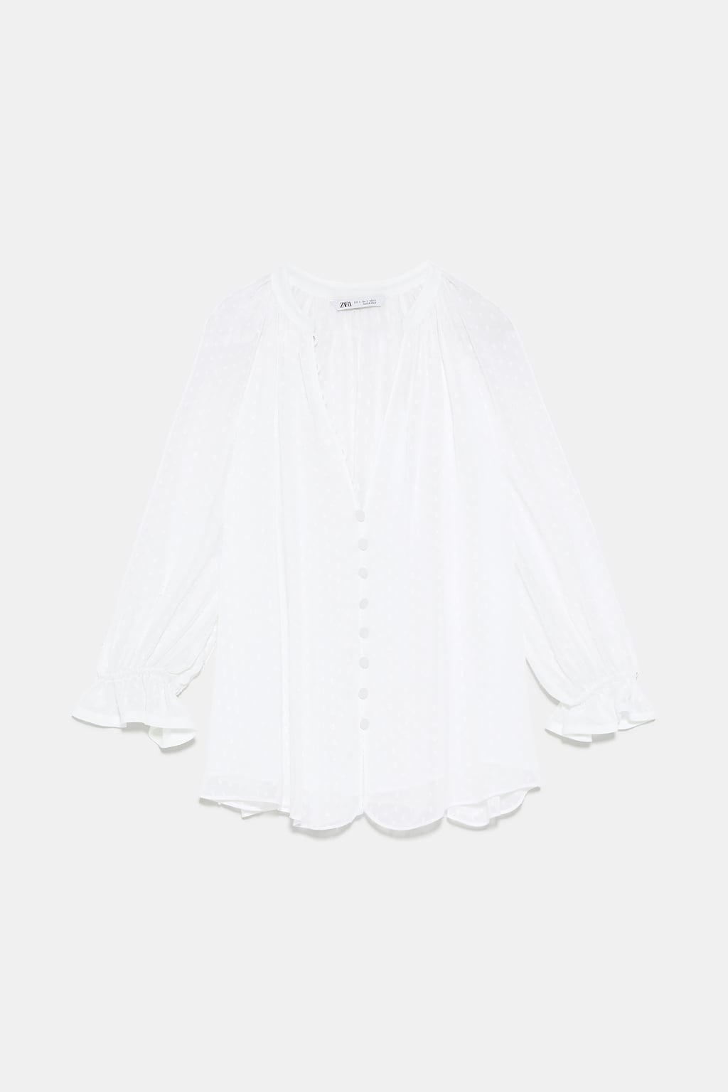 Blusa a manica lunga in cotone bianca- Gonna nera plissé in pelle- Cintura con maxi logo- Sandali bassi con piume- Borsa shopping marrone con stampa fenice