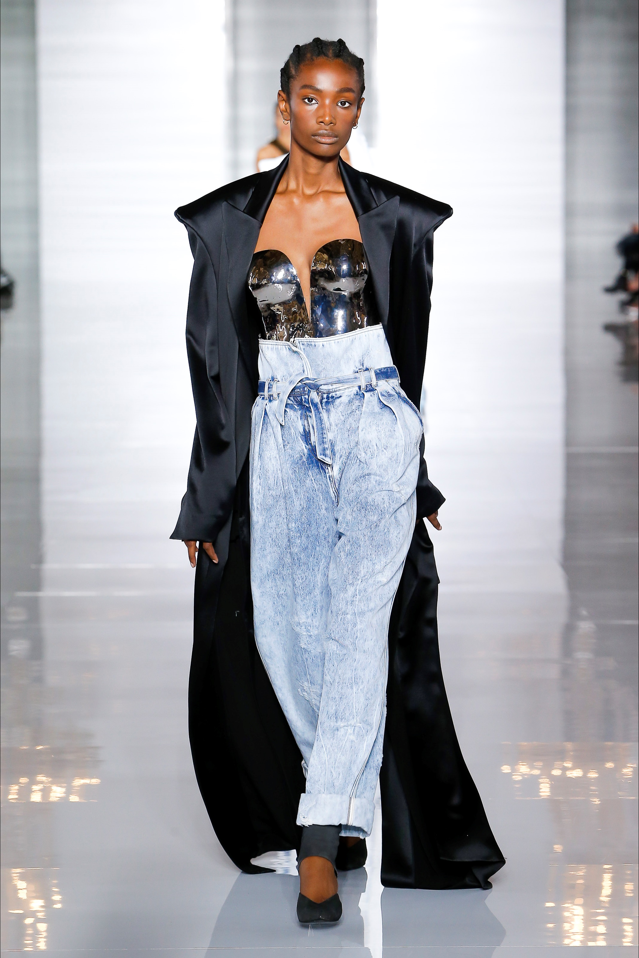 Jeans vita alta con cintura- Body argento- Giacca lunga nera in raso- Decolletè nere