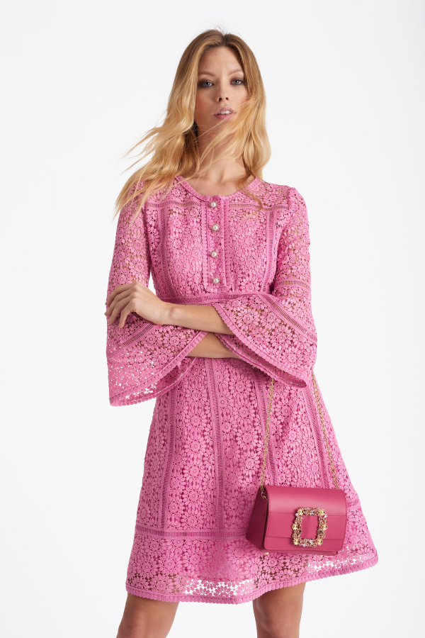 Luisa Spagnoli propone l’abito in viscosa e pizzo color glicine con fiocco e fibbia di Swarovski in vita oppure vestiti lunghi in jersey da portare con sandali bassi.