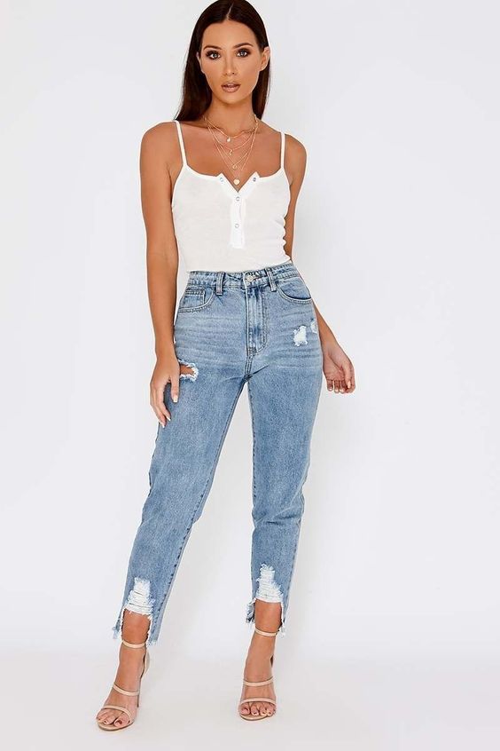 - JEANS MOM-FIT + CROP-TOP + SANDALI