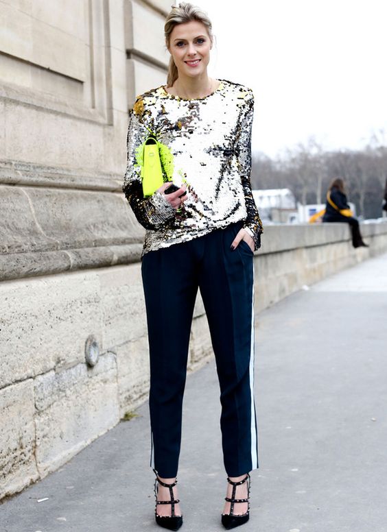 Tra gli outfit più audaci il total look scintillante ma anche solo una camicia un top, shorts o una giacca possono bastare per splendere nelle notti estive. Quando si decide di indossare un capo di questo tipo è necessario non esagerare con gli accessori, niente collane o chandelier e per quando riguarda scarpe e borsa semplicità ed essenzialità vincono. L’effetto too much è dietro l’angolo. Altri modi per creare un look sparkling? Arrivano