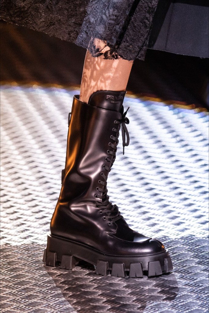 Per l’autunno-inverno 2019-20 abbiamo già parlato degli stivali cuissardes e non possiamo non menzionare anche gli anfibi. Lo stile army ha caratterizzato le sfilate come Prada, Alexander McQueen con stivaletti stringati e platform importante, smorzati da abiti leggeri e tailleur sartoriali. Sono diventati un cult della scarpiera femminile e pezzo imprescindibile per creare un look militare. Ecco qualche esempio dalle passerelle:
