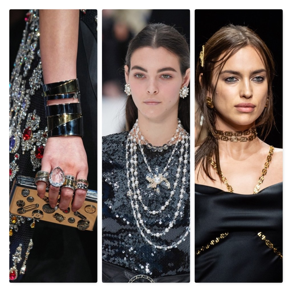 Le tendenze sono davvero evidenti, guardando i look di queste sfilate. Le collane sono decisamente MAXI e lunghe, ma continua ancora il trend dei choker. I bracciali sono rigidi e, come le collane, maxi. Gli anelli? Chi più ne, più ne metta, per un effetto glam-rock! Gli orecchini invece hanno un’unica e sola prerogativa: si portano spaiati.