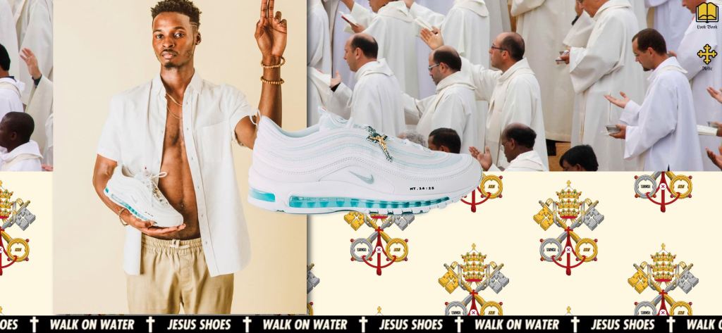 Esattamente che cosa si intende per Jesus sneakers? Si tratta di uno dei modelli storici, Air Max 97, rivisitato con elementi religiosi, nello specifico un crocefisso legato ai lacci, l’acqua santa nella suola con 60 cc di acqua prelevata dal fiume Giordano e benedetta da un sacerdote, un verso del vangelo stampato sulla scarpa e stemma pontificio sulla suola. Il brand americano MSCHF, le ha pensate e regalate a sei celebrities di YouTube e al cantante Asap Rocky che hanno rilanciato le scarpe con post sui social e poi sono andate in vendita sul sito StockX, piattaforma americana di vendite all’asta di sneakers. Sono andate letteralmente a ruba in 24 ore, nonostante i quasi 3.000 dollari del costo.