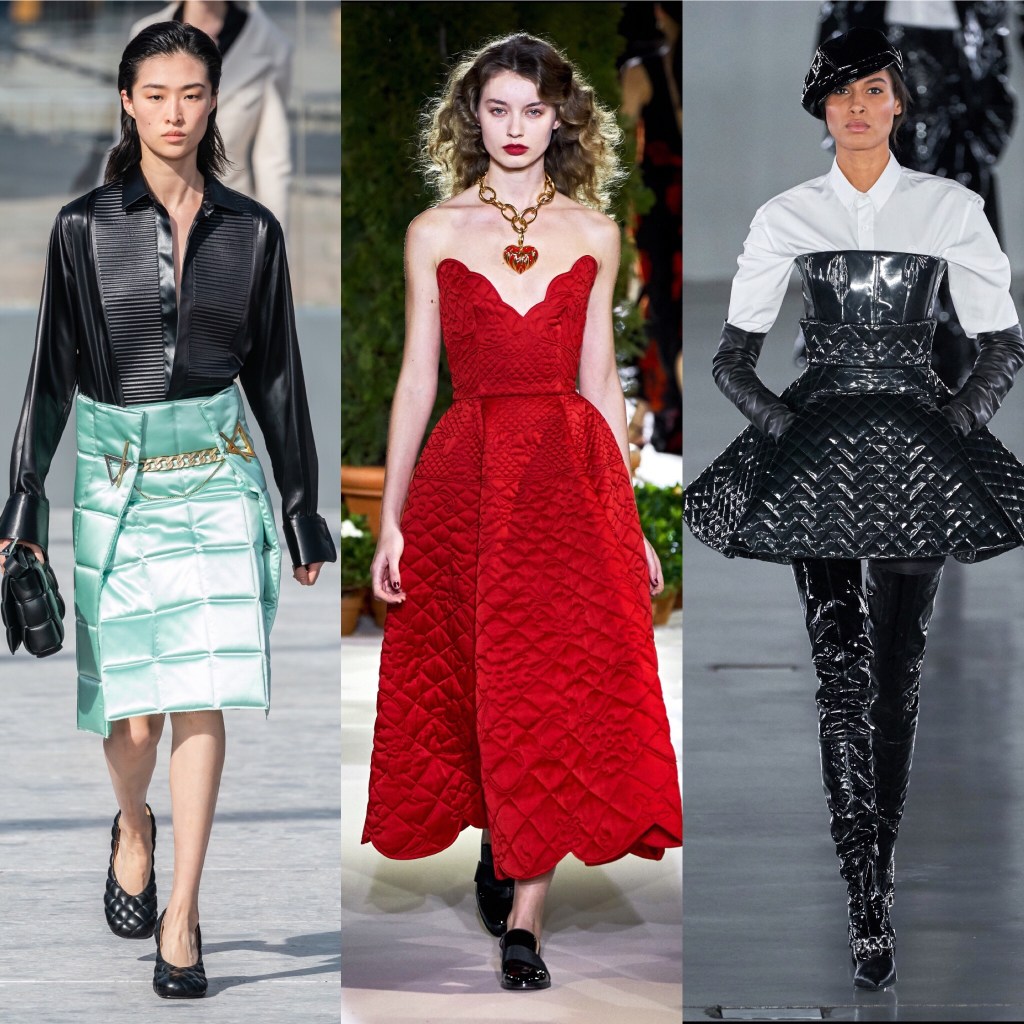 Ogni anno vengono proposti capi di abbigliamento ed accessori dall’effetto “trapunta”. Danno l’idea di indossare qualcosa di avvolgente, confortevole, caldo, che allieta in qualche modo le fredde giornate invernali. Le proposte dell’autunno-inverno 2019/20 sono state: eleganti cappotti modello vestaglia, soffici jumpsuit , insoliti abiti da gran soirè trapuntati, pantaloni e gonne, baker boy hat, ma non sono mancate chiaramente le borse e le dècolletè con disegno e rombi in rilevo. Vediamo qualche esempio: