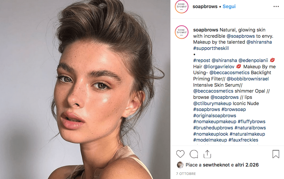 Soap browns, letteralmente sopracciglia di sapone, è l’effetto naturalmente spettinato delle sopracciglia. Soap Brows indica una specifica tecnica di “messa in piega” delle sopracciglia. Per ottenere questo effetto si usa una saponetta al posto del gel. Un metodo che in realtà i make-up artist professionisti usano da sempre perché garantisce una tenuta maggiore, e che i social hanno contribuito a rendere main stream.