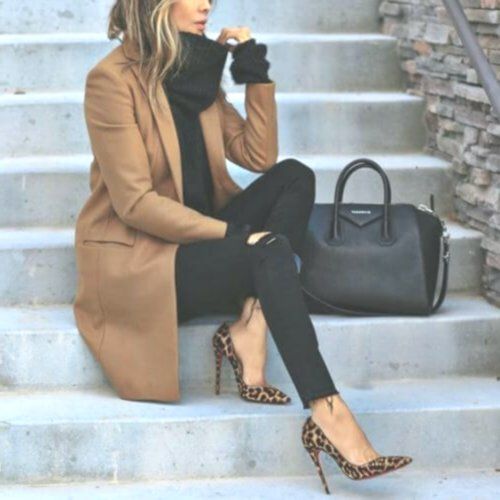 - CAPPOTTO CAMMELLO + MAGLIONCINO NERO + JEANS + STIVALETTI CON TACCO