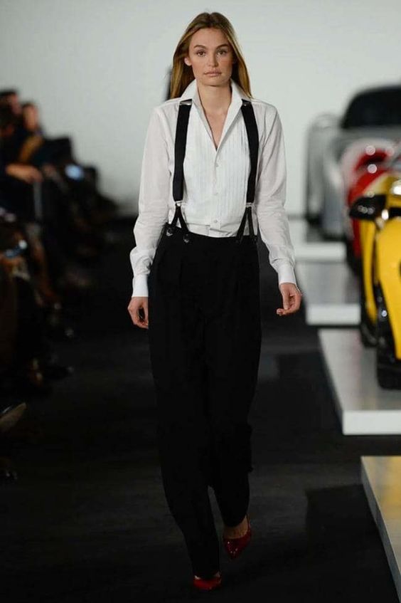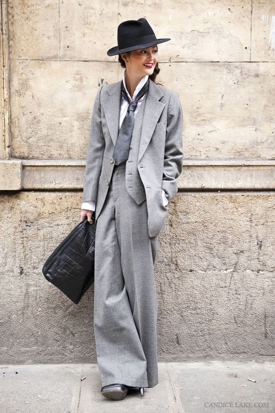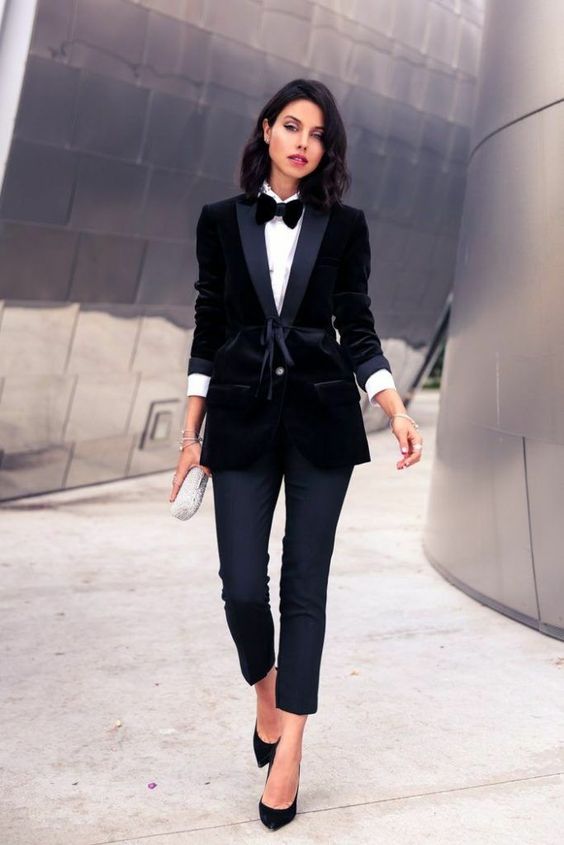 –Completo giacca e pantalone: total look, solitamente si preferisce lo stesso tessuto. Principe di galles, gessato, spinato, ed anche il velluto. Mentre il pantalone deve avere due caratteristiche: taglio maschile e vita alta in modo da slanciare la figura e renderlo il più femminile possibile. La giacca, in abbinamento al pantalone, è over, con chiusura a mono o doppiopetto per sottolineare il punto vita.