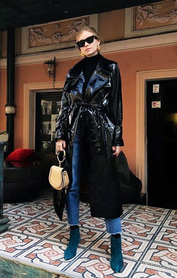 Super gloss, protagonista assoluto dell’outfit, cosa sarà? Il vinile! Tessuto che certamente non passa inosservato e crea look davvero originali. Facendo un breve excursus storico, il vinile venne preso in considerazione per la prima volta dalla stilista Elsa Schiaparelli, che stufa delle solite stoffe decise di provare nuovi materiali sintetici e plastici. Successivamente, grazie a quella che viene definita Space Age tra gli anni 60′-70′, stilisti quali André Courrèges, Paco Rabanne, Pierre Cardin utilizzarono sempre di più questo materiale innovativo ed originale per la creazione di abiti aderenti, minigonne ( il famoso “effetto bagnato” di Mary Quant), ed accessori come gli indimenticabili stivali. Anche gli anni 80′ lo hanno visto protagonista, ma il grande ritorno in passerella è dovuto al visionario Karl Lagerfeld che nella sua collezione SS2018 ripropone una donna urbana e futurista.