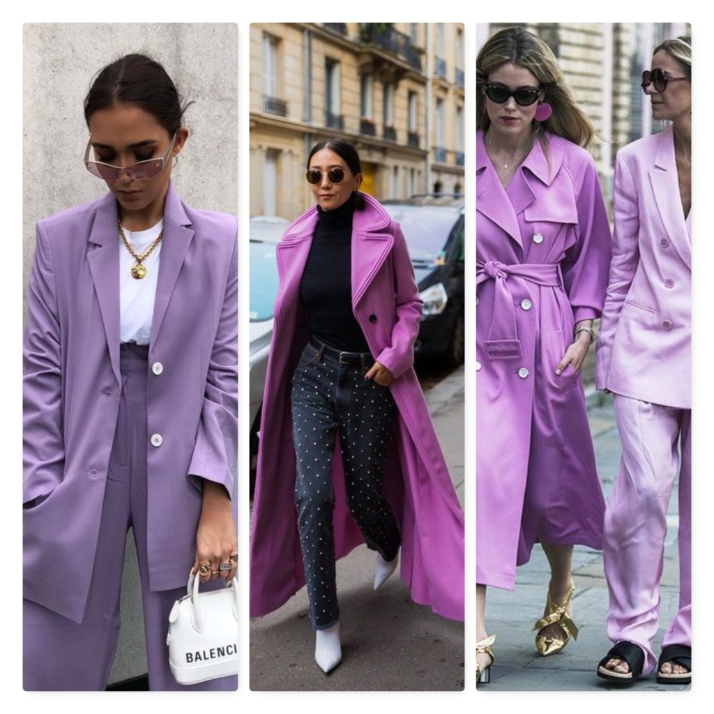 Il viola, e i suoi svariati toni, si abbinano a bianco, nero, giallo, blu, rosso, ruggine, arancio, rosa; un vero e proprio basic e passpartout. Di tendenza assoluta è il tailleur in viola o glicine, il blazer oversize, il dolcevita, la blusa con volant o maniche a palloncino e spalline anni ’80, la gonna plissè, il jeans, il cardigan.