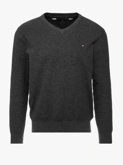 FENDI UOMO: MAGLIONE GRIGIO SCOLLO A V IN STAMPA GESSATA – CAMICIA GRIGIO PERLA – CRAVATTA BLU – PANTALONE SARTORIALE BLU CON DETTAGLI GRIGI – STRINGATE NERE – BORSA A MANO GRIGIA