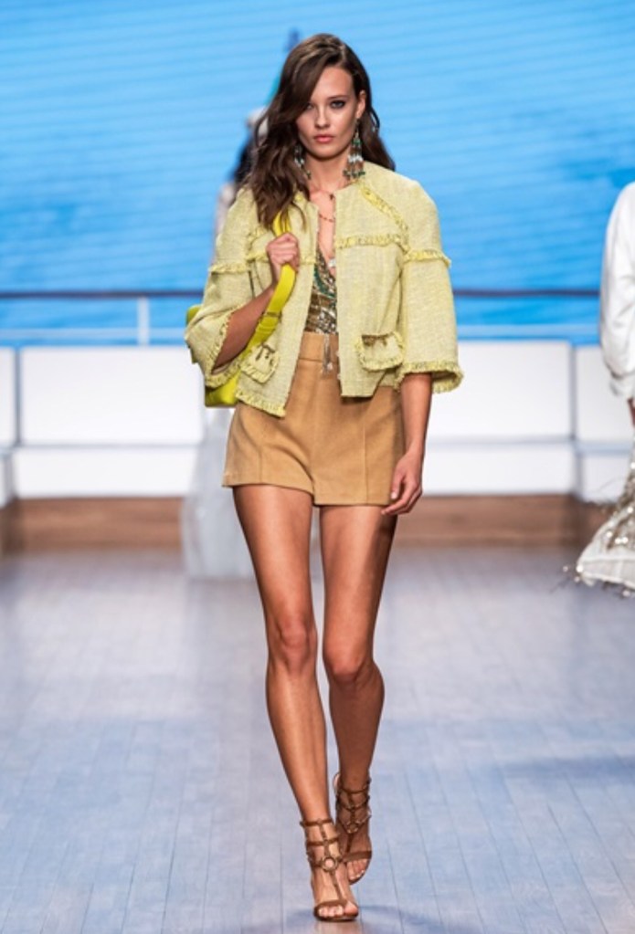 ELISABETTA FRANCHI: GIACCA CORTA CON MANICA A TRE QUARTI – TOP FANTASIA – SHORTS VITA ALTA BEIGE – SANDALI MARRONI – BORSA A SPALLA GIALLA