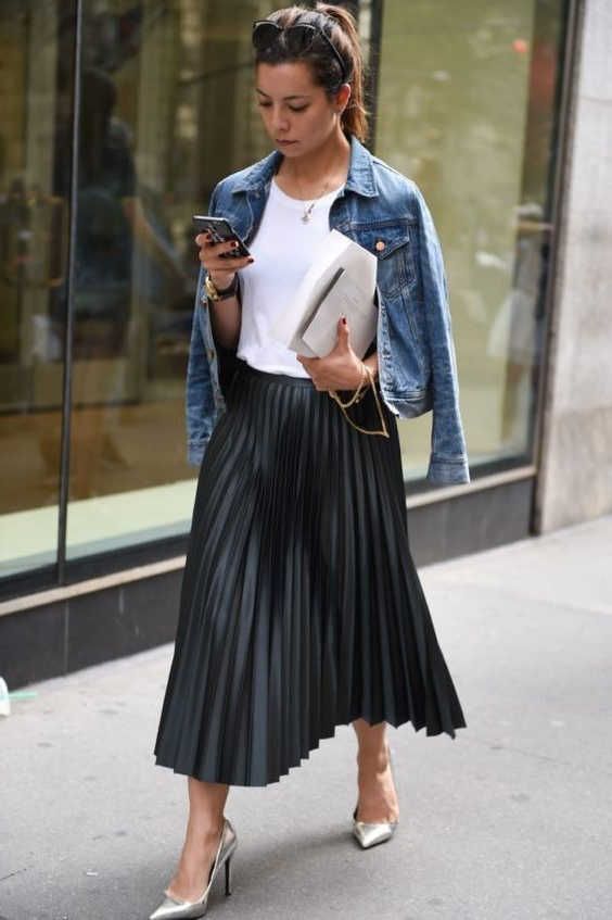 GIACCA DI JEANS-TSHIRT BIANCA-GONNA PLISSE’ NERA-SLINGBACK NUDE