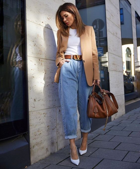BLAZER OVERSIZE BEIGE + TSHIRT BIANCA +JEANS SLOUCHY -DECOLLETE BIANCHE + BORSA A MANO MARRONE + CINTURA MARRONE
