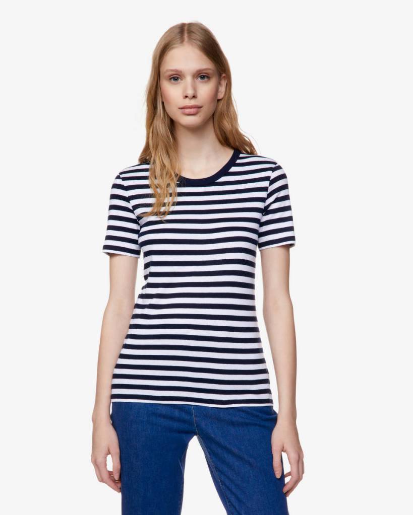 TORY BURCH LOOK: T-SHIRT A RIGHE MEZZA MANICA – PANTALONE PALAZZO BEIGE – BORSA A TRACOLLA CUOIO