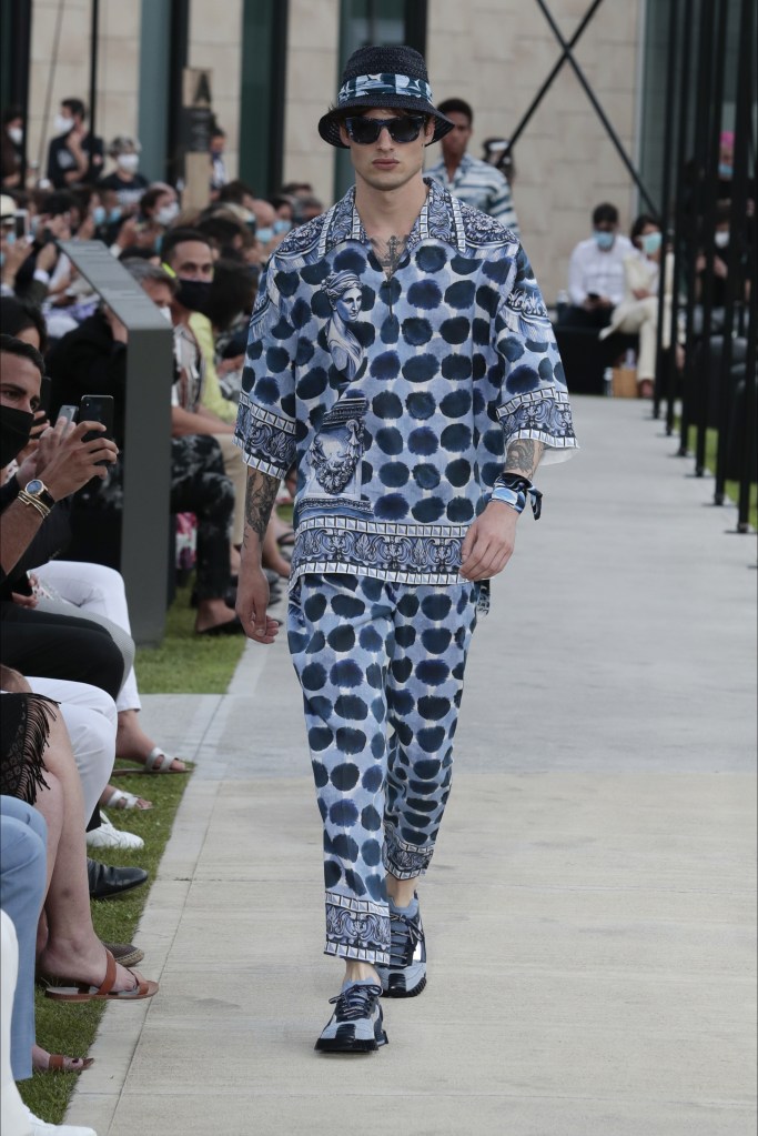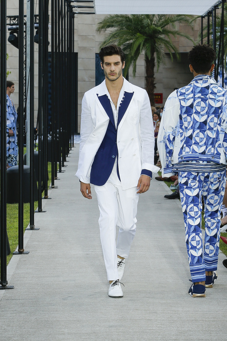 Nel parco dell’Ospedale Humanitas e con il sottofondo della voce dei tre tenori de Il Volo, sfila la nuova collezione uomo primavera estate 2021.