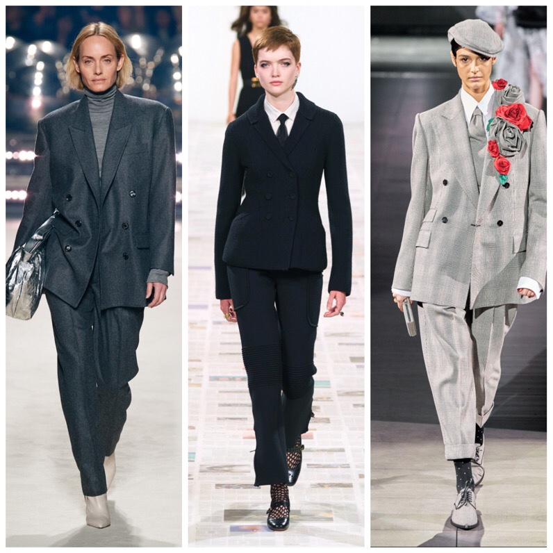 Fluidità, eleganza ed essenzialità sono le parole che più rappresentano i completi di stagione. In abbinamento ritroviamo elementi prettamente maschili come il cravattino, il gilet e l’uso delle stringate, ormai nella scarpiera femminile già da qualche anno. Oltre a questo un tocco di femminilità deve esserci e lo si ha nell’uso di gioielli come orecchini o bracciali ben evidenti, cinture, e le immancabili maxi-bag. Possiamo dire che un’ondata di androginia travolge le collezioni dell’Autunno-Inverno 2020-21.