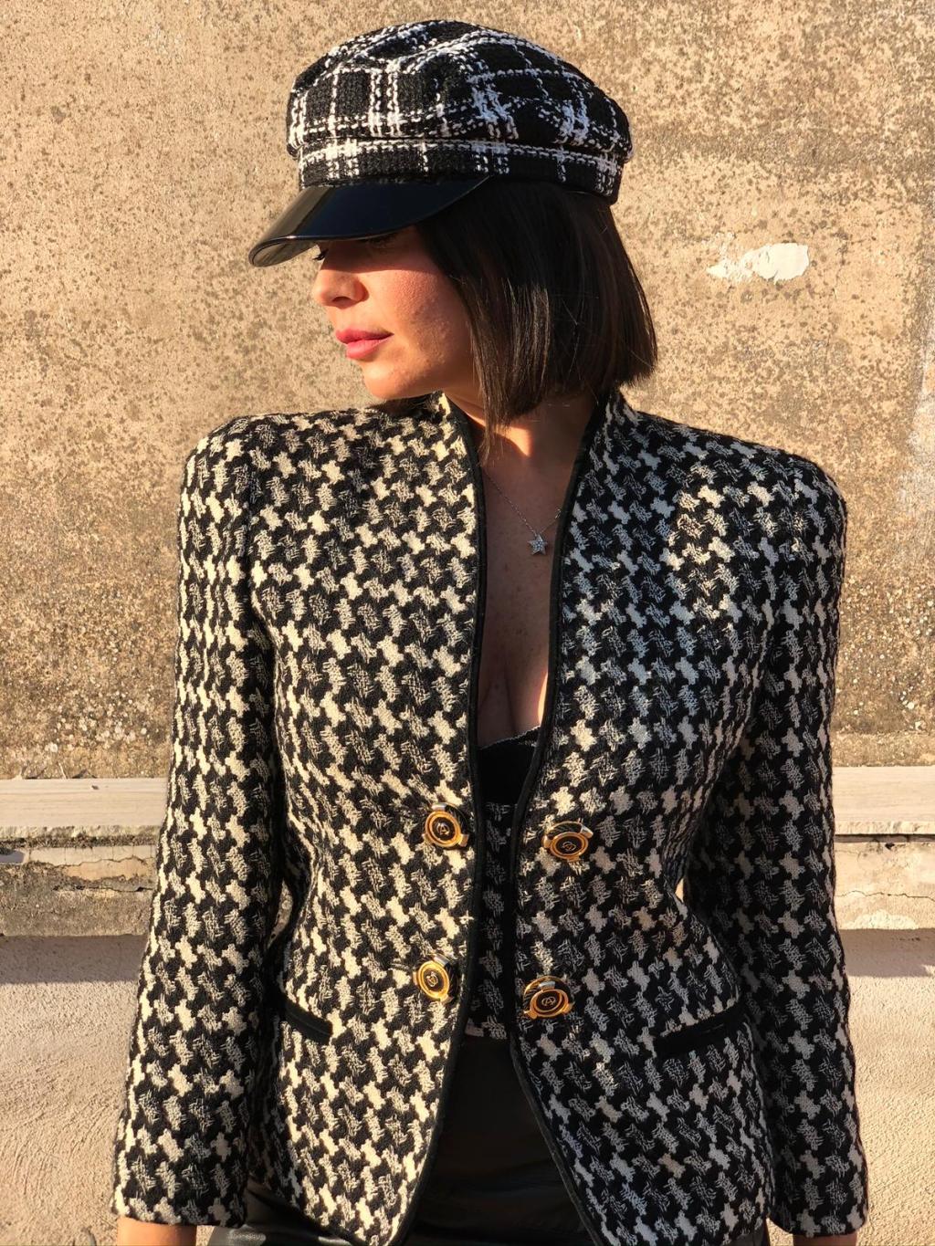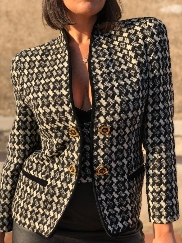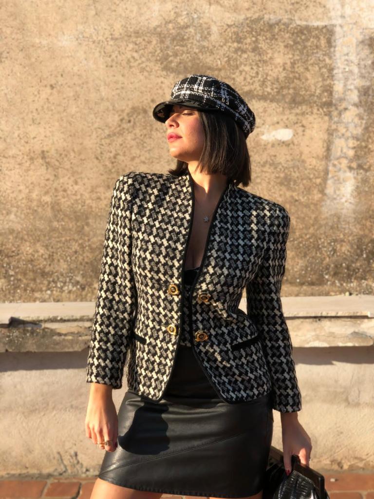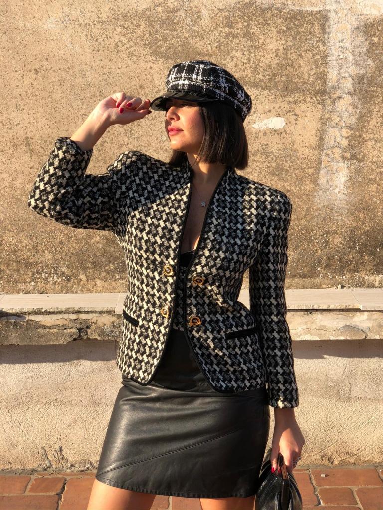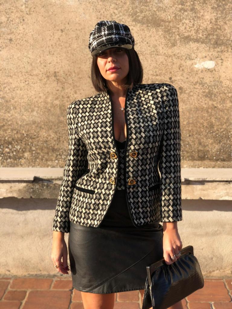 In questo caso Marechiaro Closet, e-commerce di abiti vintage propone una giacca modello Chanel con bottoni gioiello indossata con una gonna in pelle nera, il tutto per rendere la giacca meno austera, dando vita ad un look più giovane e moderno.