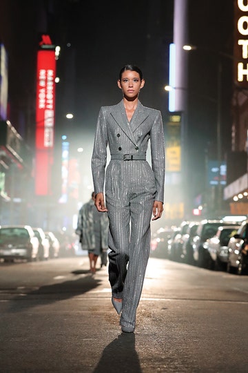 Questo show segna per Kors una rinascita in grande stile. I capi ben disegnati e i tacchi alti che assistono la falcata di donne elegantissime e felici di tornare in ufficio, o al ristorante, o a teatro: dopo aver attraversato le strade di Midtown, le protagoniste della sfilata entrano nello Shubert Theatre dove Rufus Wainwright canta un medley di “City Lights”, “New York State of Mind” e “There’s No Business like Show Business”, indossando capi che scintillano a tutte le ore del giorno e della notte: da un “jumpsuit” gessato con righine di lamé alla serie di abiti-colonna realizzati con un mosaico di piccoli specchi dorati, d’argento, neri o canna di fucile. La collezione anniversario, include la riedizione di 16 pezzi d’archivio, tra i preferiti dello stilista, che hanno fatto la storia del brand e tornano per ridefinire l’identità e l’essenza dello stile Michael Kors. Ogni capo conterrà uno speciale QR code che, attraverso un sito dedicato, ne racconterà la storia attraverso aneddoti e immagini storiche.