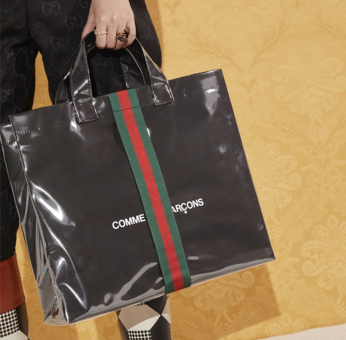 La nuova tote bag propone lo stile classico delle shopper Comme des Garçons personalizzato con il caratteristico nastro web verticale verde-rosso-verde di Gucci. Il guscio esterno trasparente assume una nuova dimensione adattandosi all’interno, in carta marrone naturale e con motivo floreale stampato per i primi due modelli, e qui proposto in nero, a chiudere il cerchio di questo processo sperimentale.
