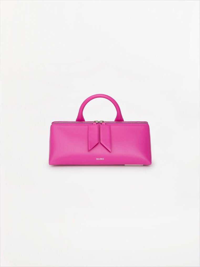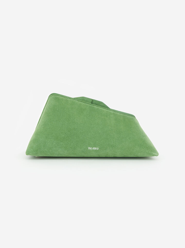 Ad esempio la borsa Monday è molto capiente a mano da giorno con manico superiore e tracolla; “Saturday” è una clutch essenziale perfetta per le sere del weekend; “8.30 PM” è una clutch oversize dalla forma piramidale distorta che si porta comodamente sotto il braccio o può essere tenuta in mano, di sera. I colori riprendono le tonalità sature dell’apparel: turchese, verde, rosso, fucsia, nero, avorio, argento, oro, oltre a sfumature naturali di sabbia e nocciola che si declinano in materiali pregiati come raso, pelle, nappa e camoscio morbido.