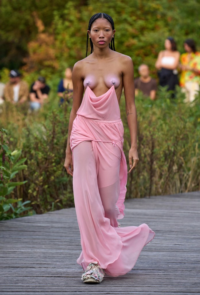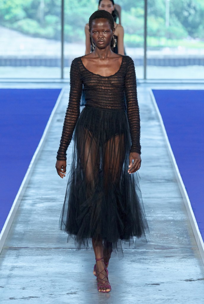 Più sportiva e rock invece la visione di Dion Lee, che propone asimmetrie e trasparenze con