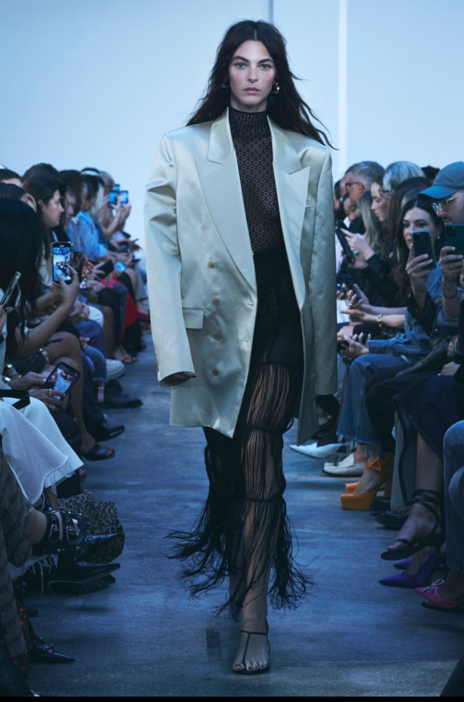 Un mix di paillettes, frange in seta, pelle e denim investe la sfilata di Khaite, che ha conquistato con la sua estetica nineties e irriverente il cuore di molti. Giacche oversize e linee seducenti creano una donna misteriosa e super confident.