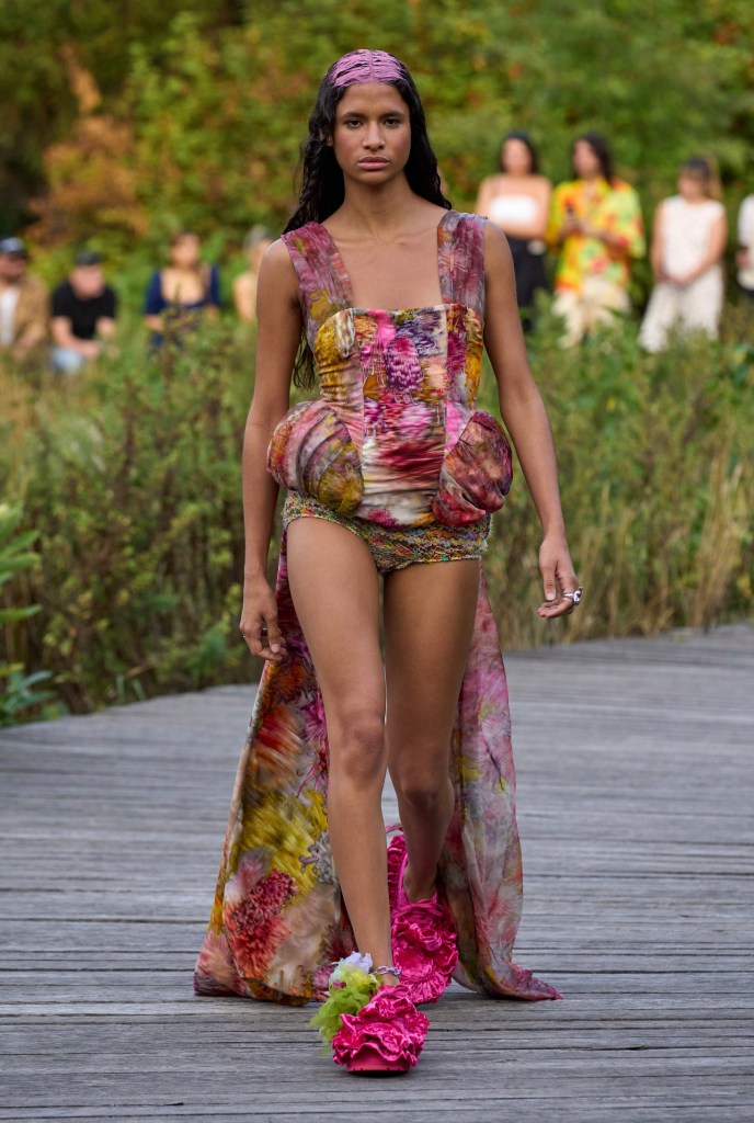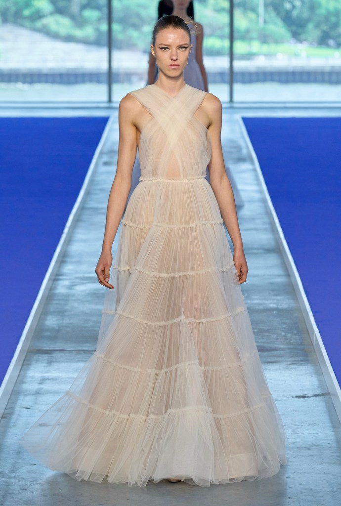 collezione che sembra citare e celebrare la natura dei pittori impressionisti. Una verve massimalista si diffonde attraverso maniche oversize, volumi in tulle drappeggiato e orecchini maxi. Viene esaltata la bellezza nella sua accezione più aulica, romantica ed ultra femminile.