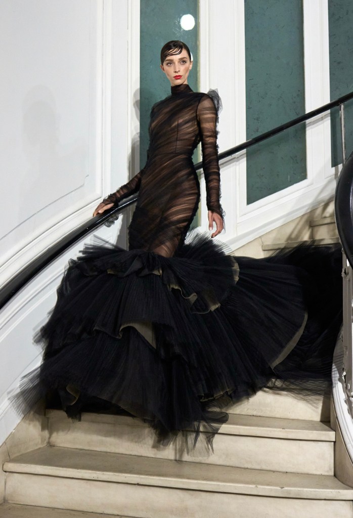 Christian Siriano firma degli abiti da sera con drappeggi e gonne di ruches super voluminose, che trasportano la mente in atmosfere incantate. Il colore nero è comune, a rimarcare quel tocco grunge anni ’90.