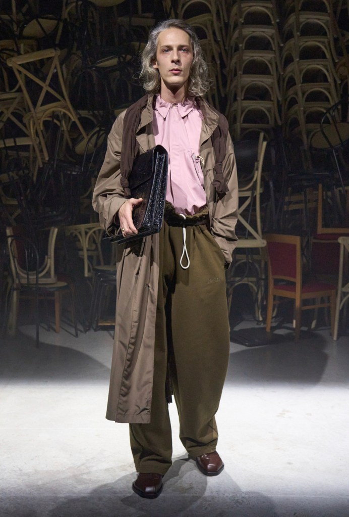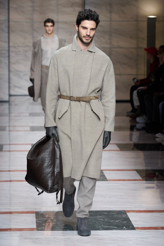 Da Fendi l’eleganza maschile continua a tingersi di peculiarità fino ad ora associate solo all’abbigliamento femminile, come ad esempio maglioni monospalla e trasparenze. Silvia Venturini Fendi porta in passerella una forte dimostrazione di classicismo rivoluzionario. Silhouette asimmetriche e giochi di pieni e vuoti che scoprono il corpo si sviluppano su un guardaroba dalla palette colori sobria, che si alterna tra sfumature di grigio tortora, avena, terra d’ombra, moka, malva, lavanda, blu scuro e nero.