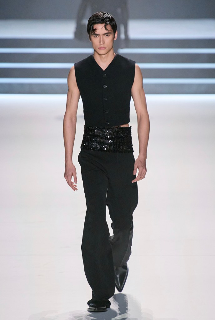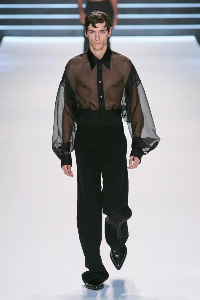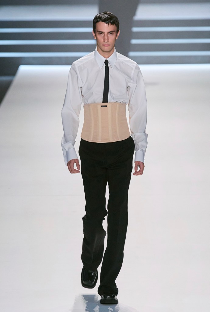 Dolce & Gabbana si fa portavoce di una nuova eleganza maschile, attraverso un guardaroba che attinge capi ed ispirazione da quello femminile. Adotta l’abito sartoriale come la divisa dell’uomo 2023, che non rinuncia mai all’eleganza, ma la attualizza, la rende contemporanea e stupisce tutti abbinandolo al corsetto da uomo. E’ indossato a petto nudo o sovrapposto a camicia e cravatta, tutto in nero e grigio antracite, decorato e sartoriale.