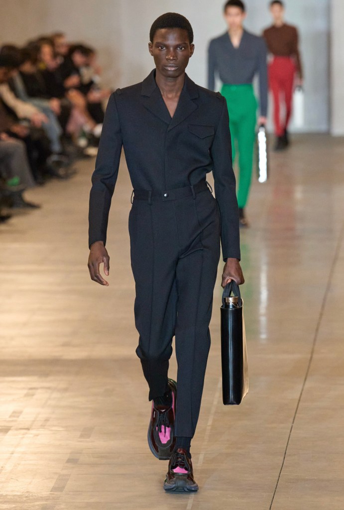 Nessun orpello o concessione di stravaganza per Prada, che conferma un ritrovato interesse per l’estetica 90s. I cappotti e i cardigan in shetland sono indossati rigorosamente spalancati sul petto nudo e della camicia non rimane che un vezzoso colletto posticcio, in nuance cromatiche sofisticate e accattivanti. I montgomery e i parka si allungano stretti fino al polpaccio, mentre i colori giocano al massimo con scontri color block.