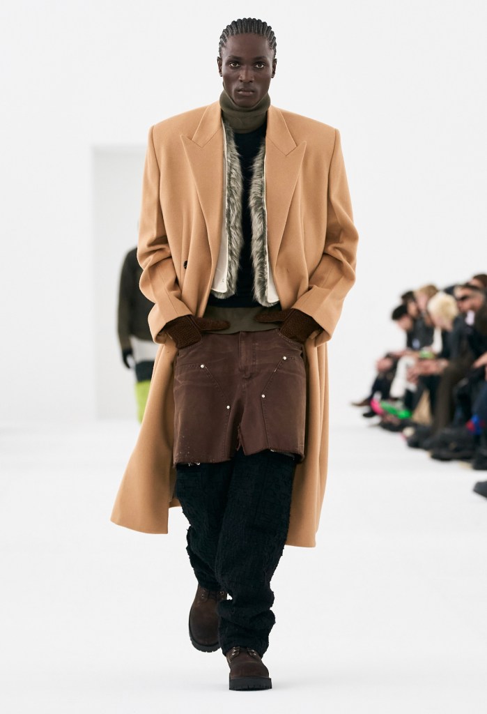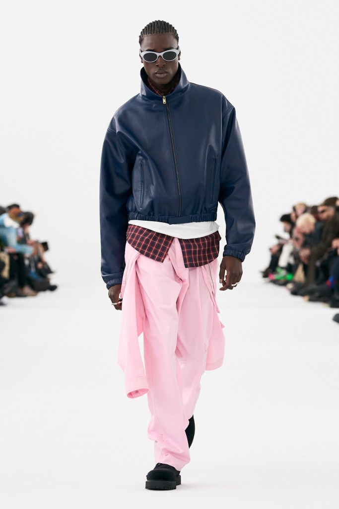 La collezione si apre con un total black sartoriale, che contribuisce a non distanziarsi troppo dal linguaggio divulgato dagli altri brand. Dopo di che, lo streetstyle si fonde con capi più formali, con bermuda in felpa e gonne corte in denim che si sovrappongono ai pantaloni.