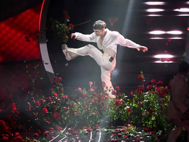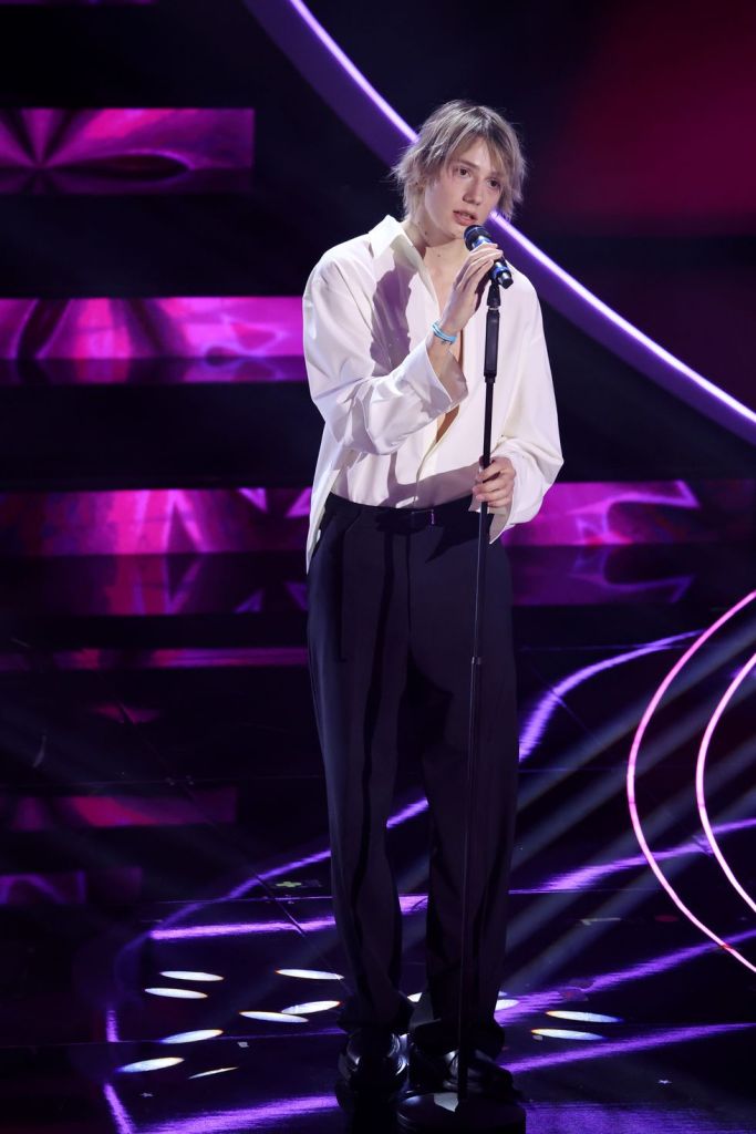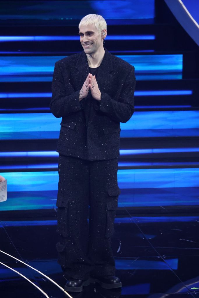 Blanco ha scelto un look dell’ultima collezione FW Dolce&Gabbana, indimenticabile per aver portato il corsetto nel guardaroba maschile. Super cool e apertissimo ai nuovo trend, Blanchitobebe ha però dato spettacolo della sua totale follia sul palco dell’Ariston, distruggendo la composizione di rose realizzata per la sua esibizione senza alcun apparente motivo.