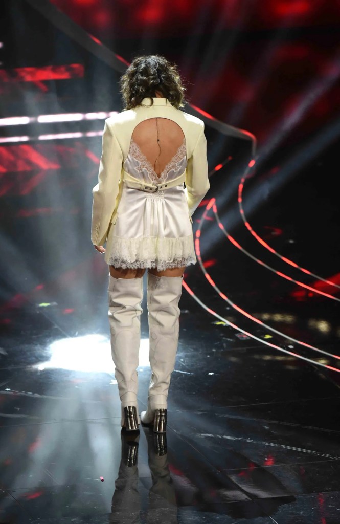 Levante indossa una micro tuta firmata Etro; Rosa Chemical ha un look sadomaso ad arte e dulcis in fundo issata su cuissardes altissimi e con la schiena incorniciata da candidi pizzi, Madame si esibisce in un look Off-White e una sferzata di sex appeal.