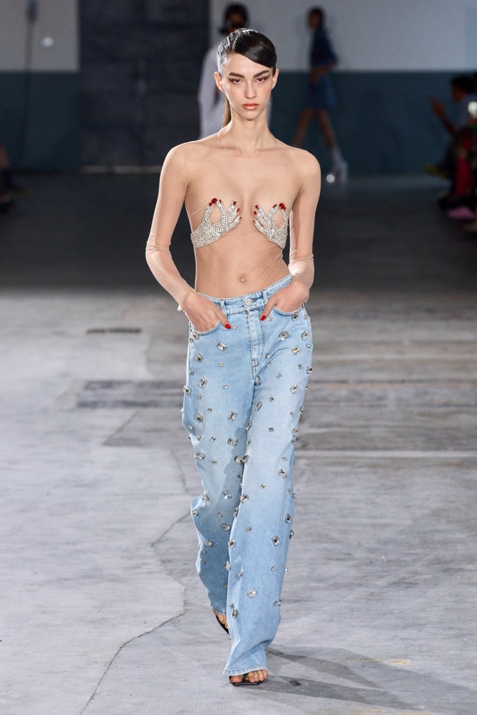 Molte maison hanno riletto i codici stilistici del jeans, provando a trasformarlo, sperimentando nuovi abbinamenti, colori e proporzioni. Le passerelle Primavera Estate 2023 sono state incantate dal denim-all-over: da Burberry, che ne fa un elemento chiave per look oversize fino a Vivetta, che lo impreziosisce di pietre preziose, o ad Alaïa, che aggiunge piume nere e lussuose.