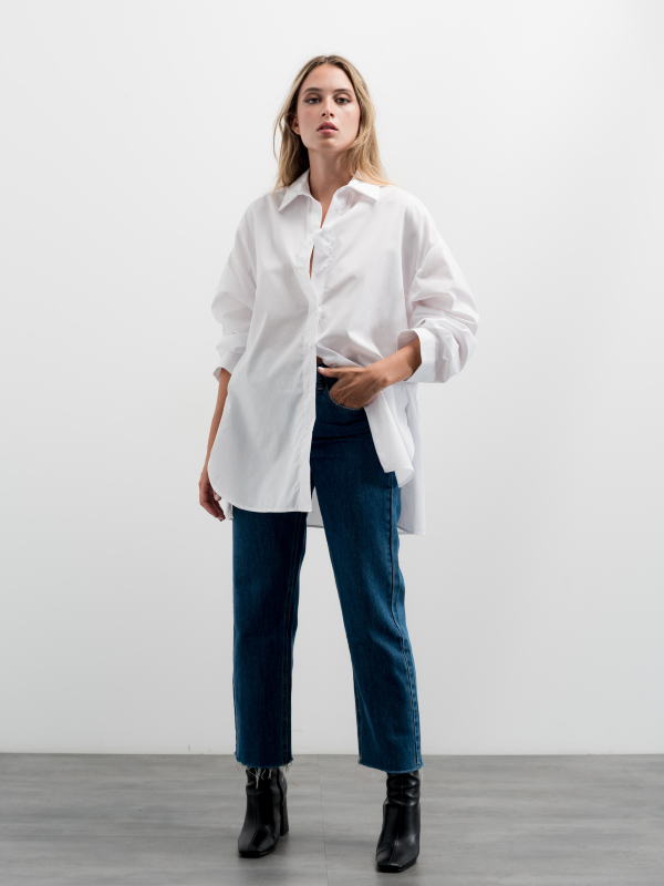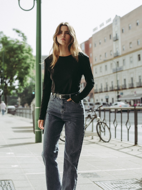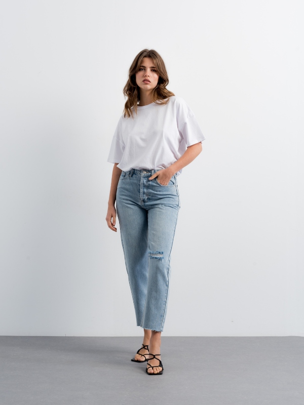 - Leggermente WIDE LEG: Jeans a cinque tasche e vita alta con gamba dritta e leggermente ampia sul finire. Orlo sfrangiato e chiusura con cerniera e bottone metallico.