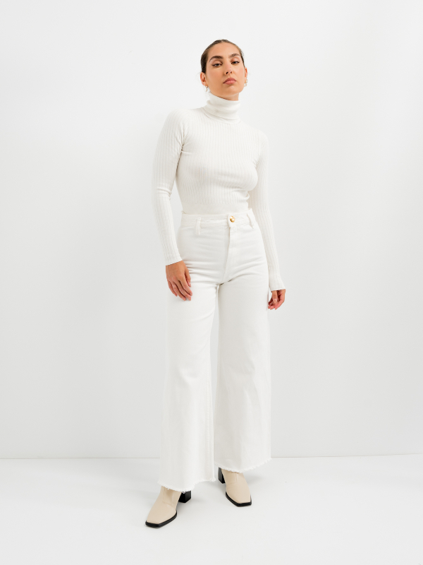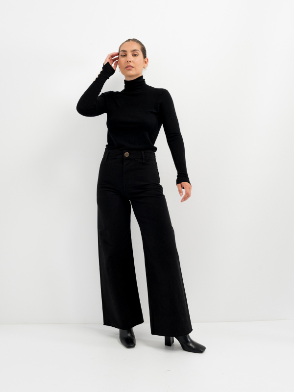 - WIDE LEG: modello a vita alta con gambale dritto e leggera svasatura finale sull’orlo sfrangiato. Chiusura con bottone centrale color oro e cerniera, tasche posteriori applicate.