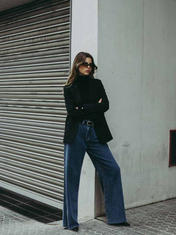 - RELAXED FIT: Jeans cinque tasche modello palazzo con gamba larga. Vita alta e pieghe morbide sul davanti. Chiusura con cerniera e bottone metallico. L’orlo è sfrangiato.