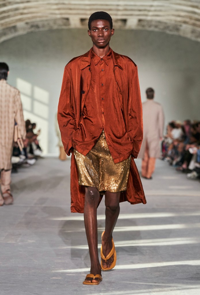 Dries Van Noten ha adottato un approccio tradizionale per la Primavera/Estate 2024, in cui i pezzi a blocchi di colore insieme a trench coat, giacche doppiopetto in seta e pantaloncini e joggers intrisi di streetwear, tailleur tradizionali con combinazioni inaspettate, come l’abbinamento di sandali con camicie con colletto, e colori vibranti sono stati i protagonisti della collezione.