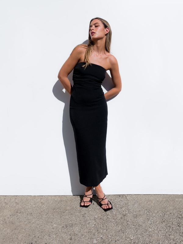 - In stile tubino anche un’altra versione: l’abito con scollo quadrato e drappeggio laterale.