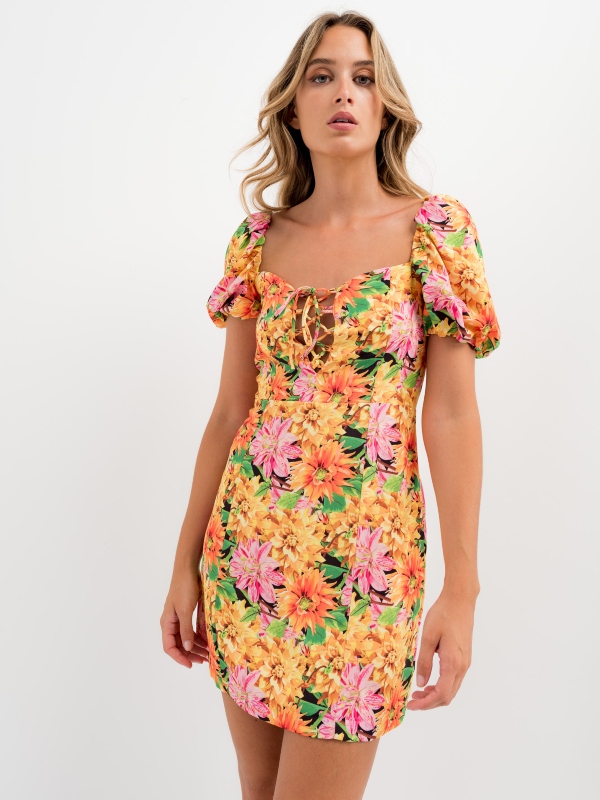 - Uno dei modelli da avere assolutamente è il tubino in stampa floreale dai colori accesi, con scollo a cuore e laccetti centrali incrociati e maniche corte a palloncino.