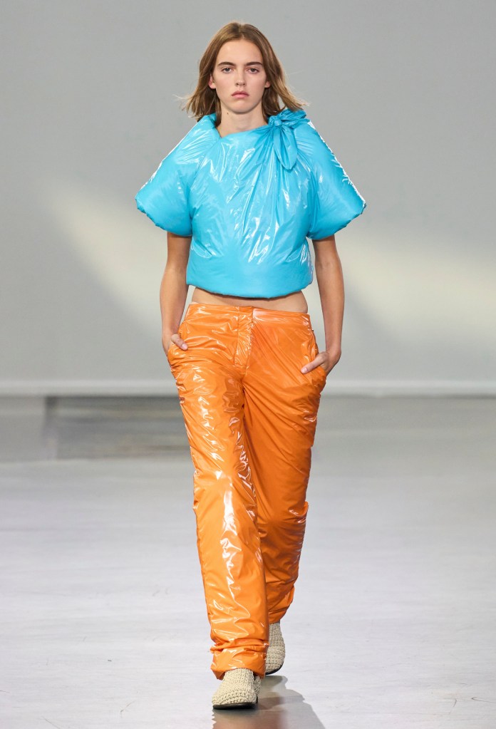 Emerge una funzionalità meno diretta del solito, con un risvolto più divertente e giocoso. I capi classici del guardaroba sono intrecciati, imbottiti, drappeggiati e stravolti.