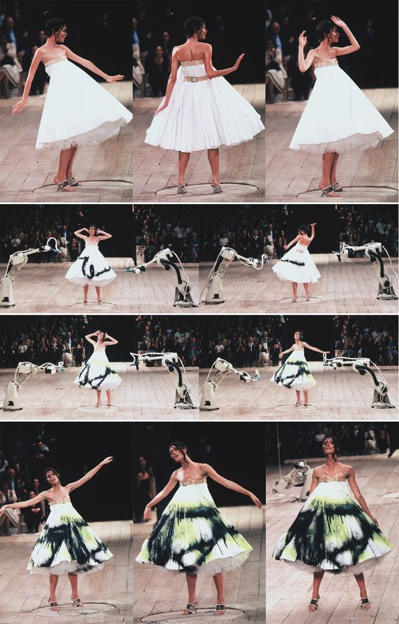 No. 13 del 1999: una sfilata degli anni ’90 per eccellenza, con una svolta, e una collezione apparentemente monocromatica con abiti in rete, raso grigio attillato e ricami delicati che diventa presto uno spettacolo tecnologico nel finale dello spettacolo. L’abito bianco senza spalline della modella Shalom Harlow, che girava su un tornello, viene spruzzato di vernice da due robot che si sono attivati alla fine della sfilata ai lati della passerella.