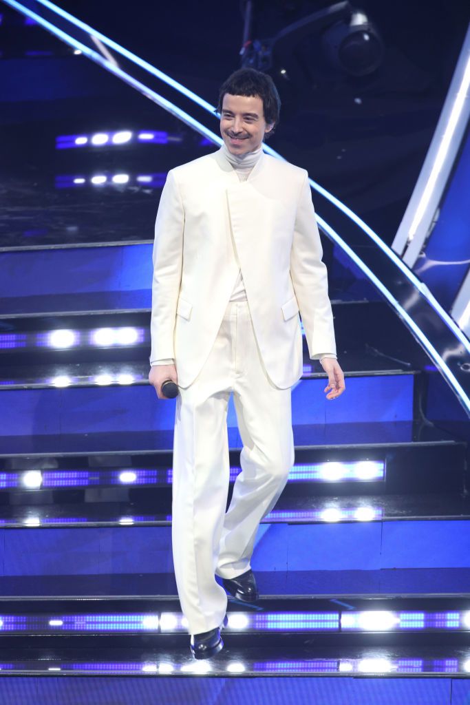 Total white per diversi artisti in questa prima serata: Sangiovanni in GCDS, Fiorella Mannoia in Luisa Spagnoli e Diodato in Zegna.