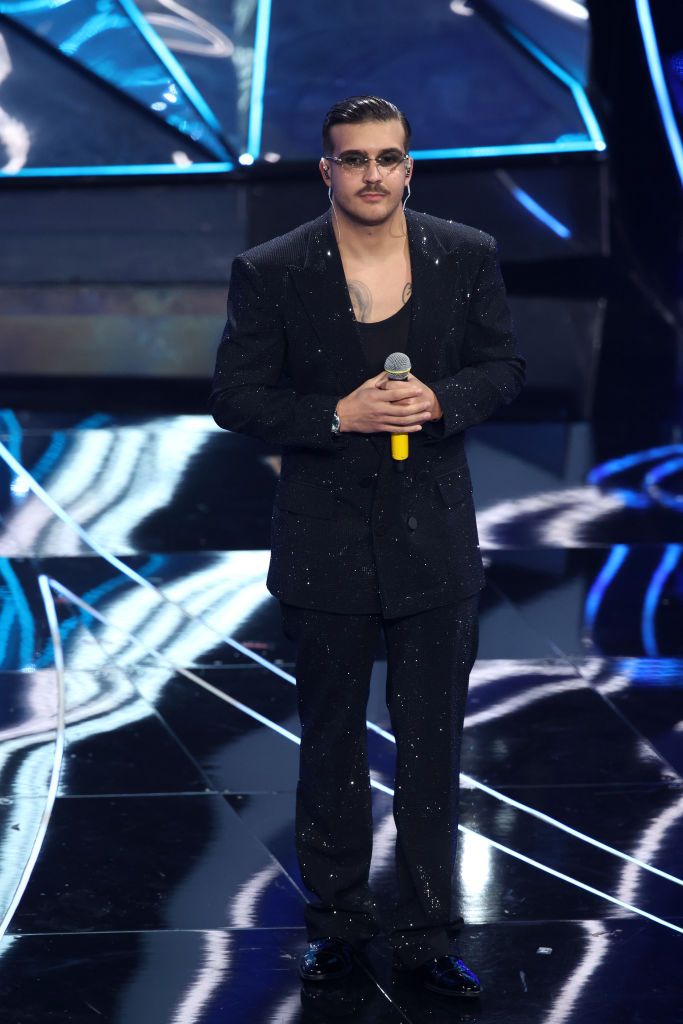 Amadeus, star suprema di Sanremo, ama brillare con i suoi completi firmati Gai Mattiolo, ma in quanto a stile viene decisamente superato da Ghali vestito in full look Loewe, composto da un cardigan in cashmere, una maglia polo in cashmere, pantaloni in denim lavato e stivali “Campo”, tutto abbellito dall’applicazione di cristalli all-over.