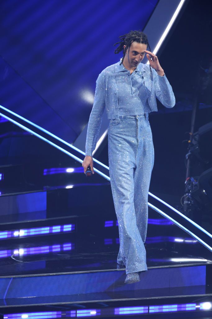 Il look d’apertura è stato solenne al punto giusto, con un completo blu Emporio Armani, la cui giacca era impreziosita con un decoro sparkling che evocava atmosfere marine. Poi, un completo in pelle burgundy firmato Versace, mentre per l’esibizione di un medley, ha indossato una maxi cappa in faille di seta nero che nascondeva un sorprendente total look Valentino, in color merlara, costituito da mantello in cady di seta, top ricamato con tecnica altorilievo e pantaloni loose fit in grisaglia di lana vergine.