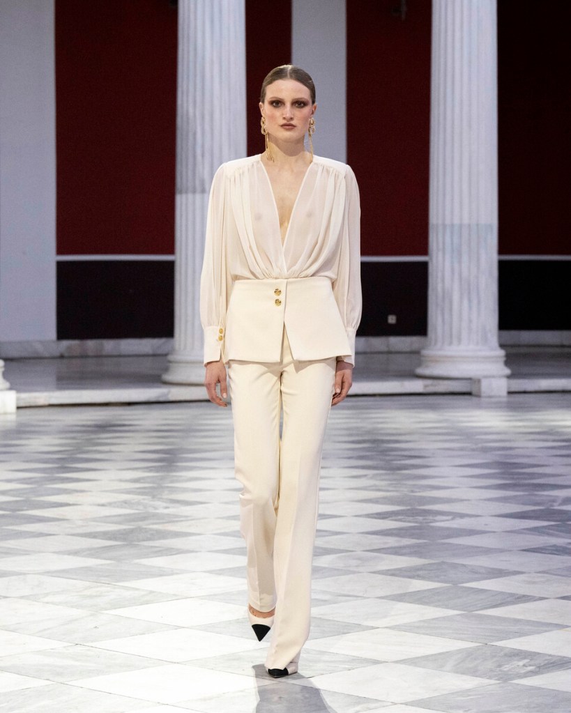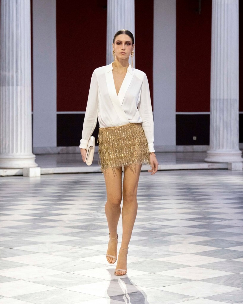 Ospite d’onore alla Fashion Week greca, la designer ha presentato la collezione Eternal, tra le imponenti colonne dell’iconico palazzo neoclassico Zappeion.